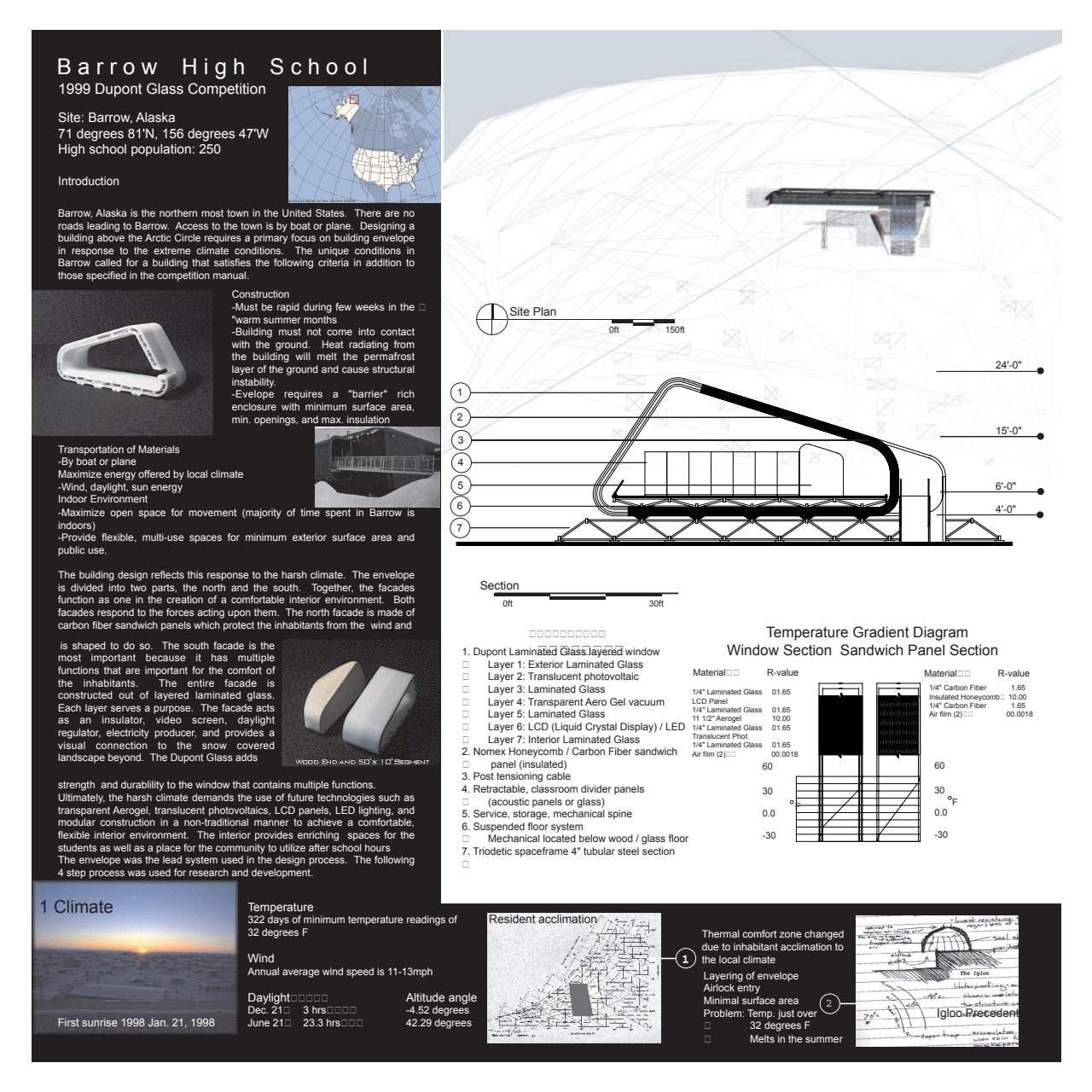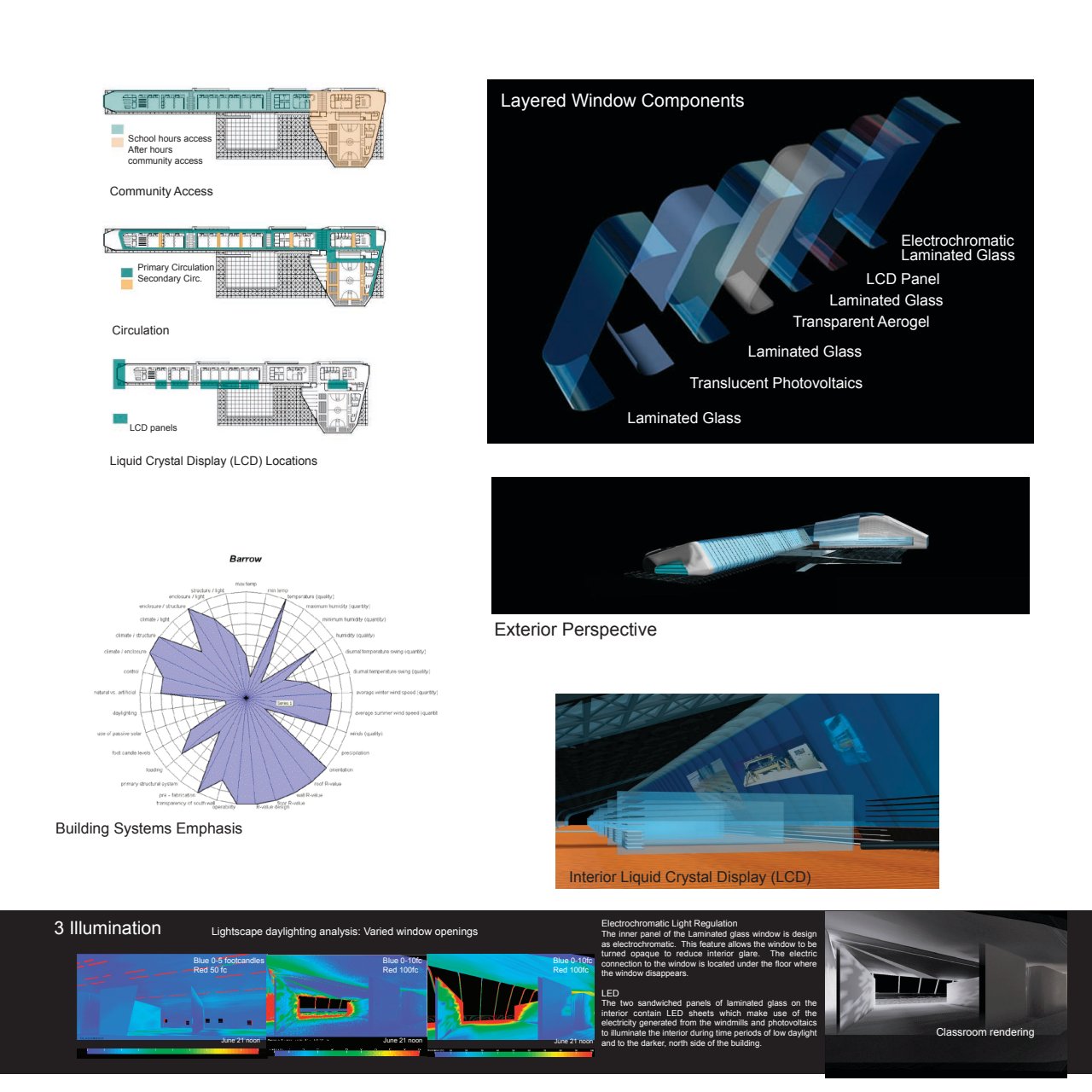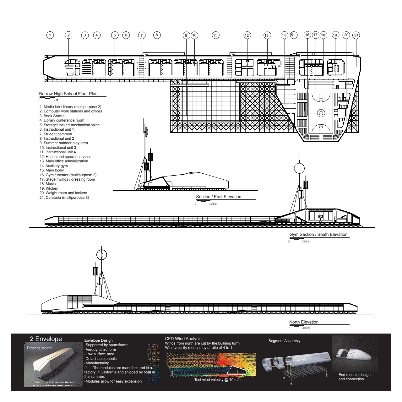 Barrow, Alaska is the northern most town in the United States. There are no roads leading to Barrow. Access to the town is by boat or plane. Designing a building above the Arctic Circle requires a primary focus on building envelope in response to the extreme climate conditions. The unique conditions in Barrow called for a building that satisfies the extreme site conditions and allows the users to find themselves in an enjoyable and innovative environment.