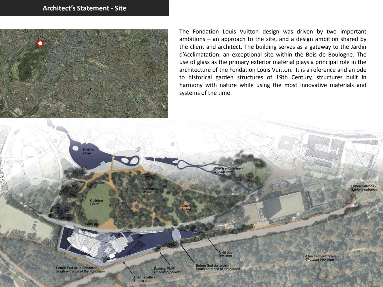 The design of the Louis Vuitton foundation was inspired by the 19th century glasshouses that previously dotted the Jardin d’Acclimatation, a landmark garden and children’s amusement park founded by Napoléon III in Paris in 1860. The 46m-high abstract structure resembles a cloud, a chrysalis or a sailing ship and is designed to blend into the natural surroundings of the park.