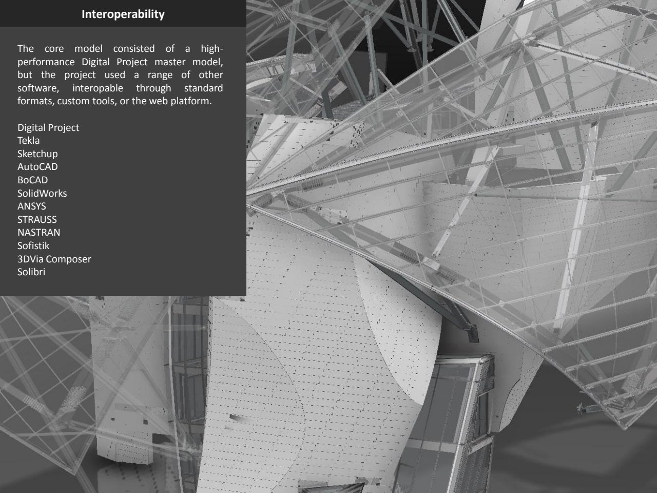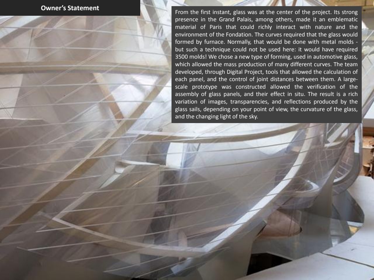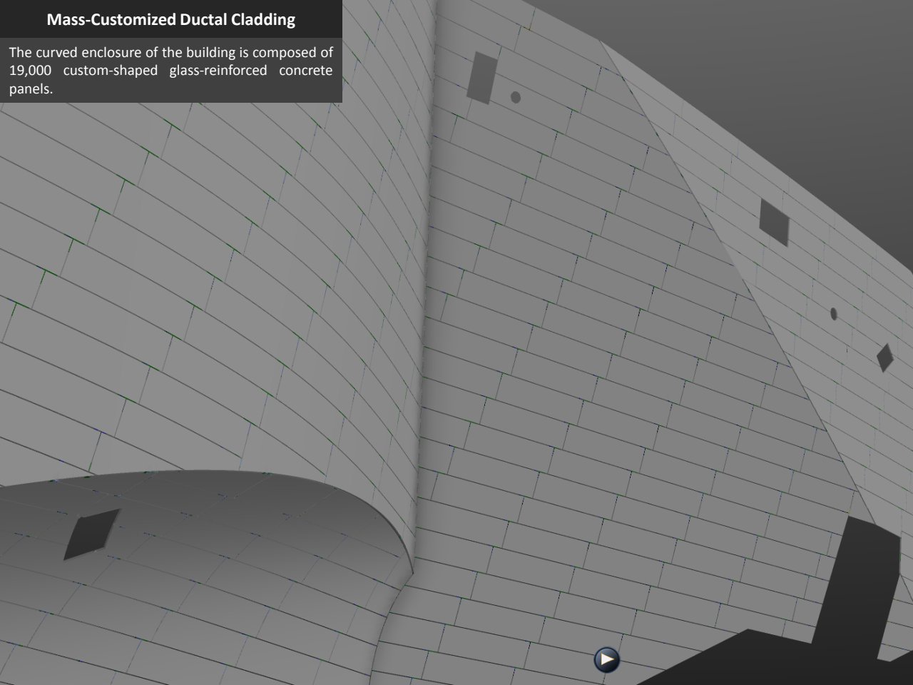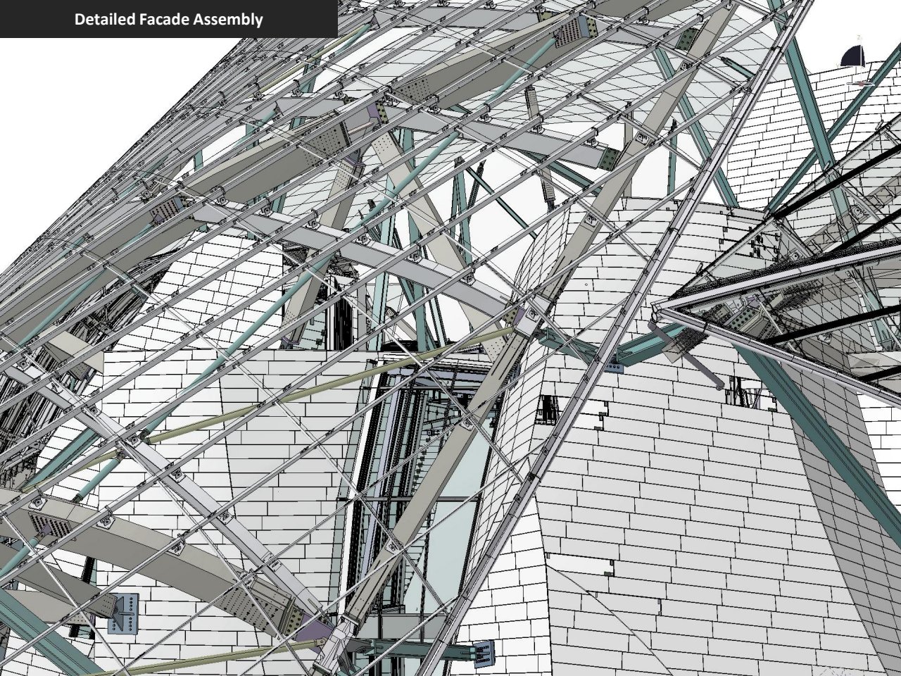 The complex structural design called for exact specifications and details of its different elements such as the curved sails and the iceberg’s surfaces. To facilitate this, a digital model of the structure was created using Digital Project software developed by Gehry Technologies for high-performance scalable 3D modelling.