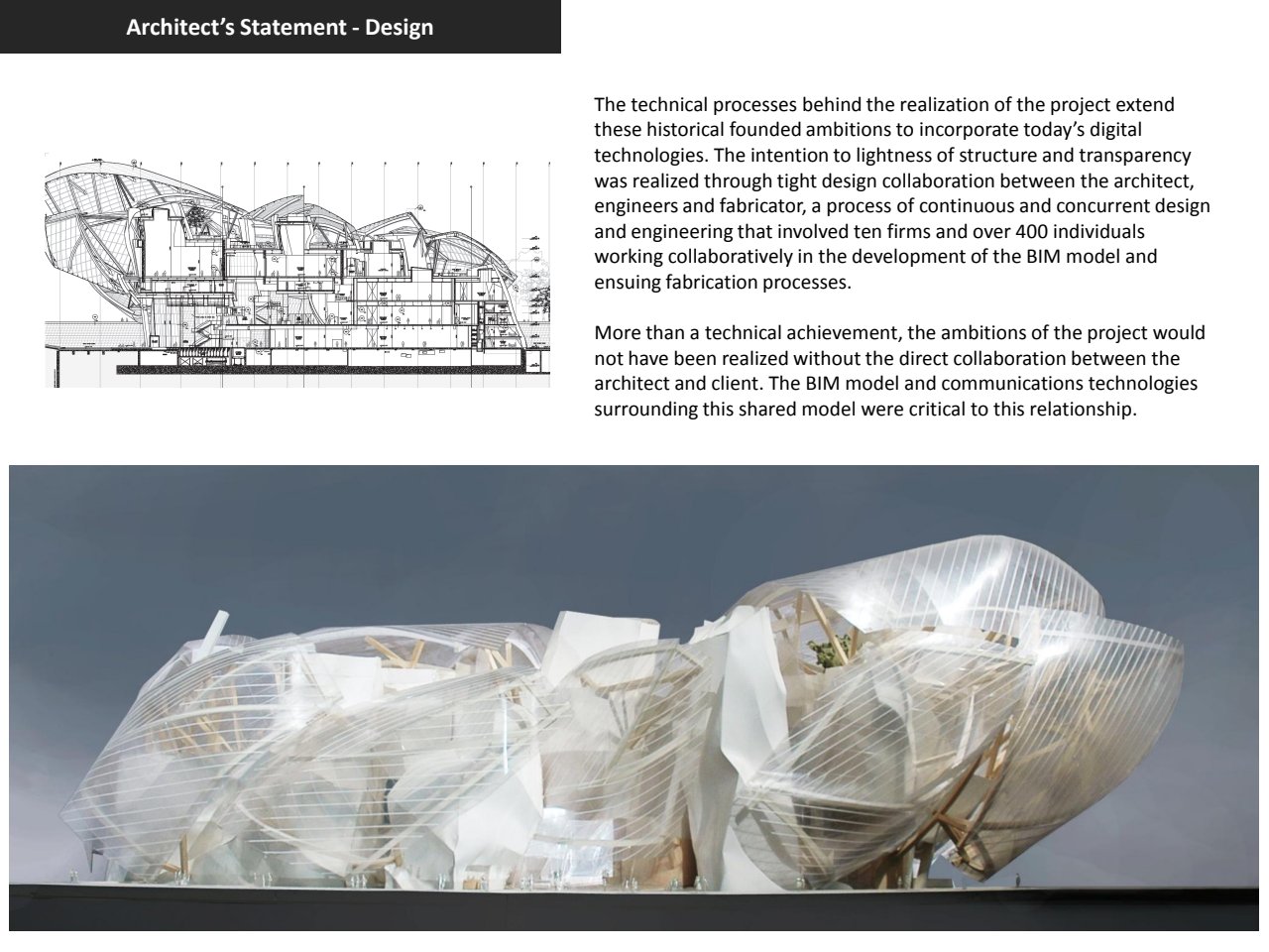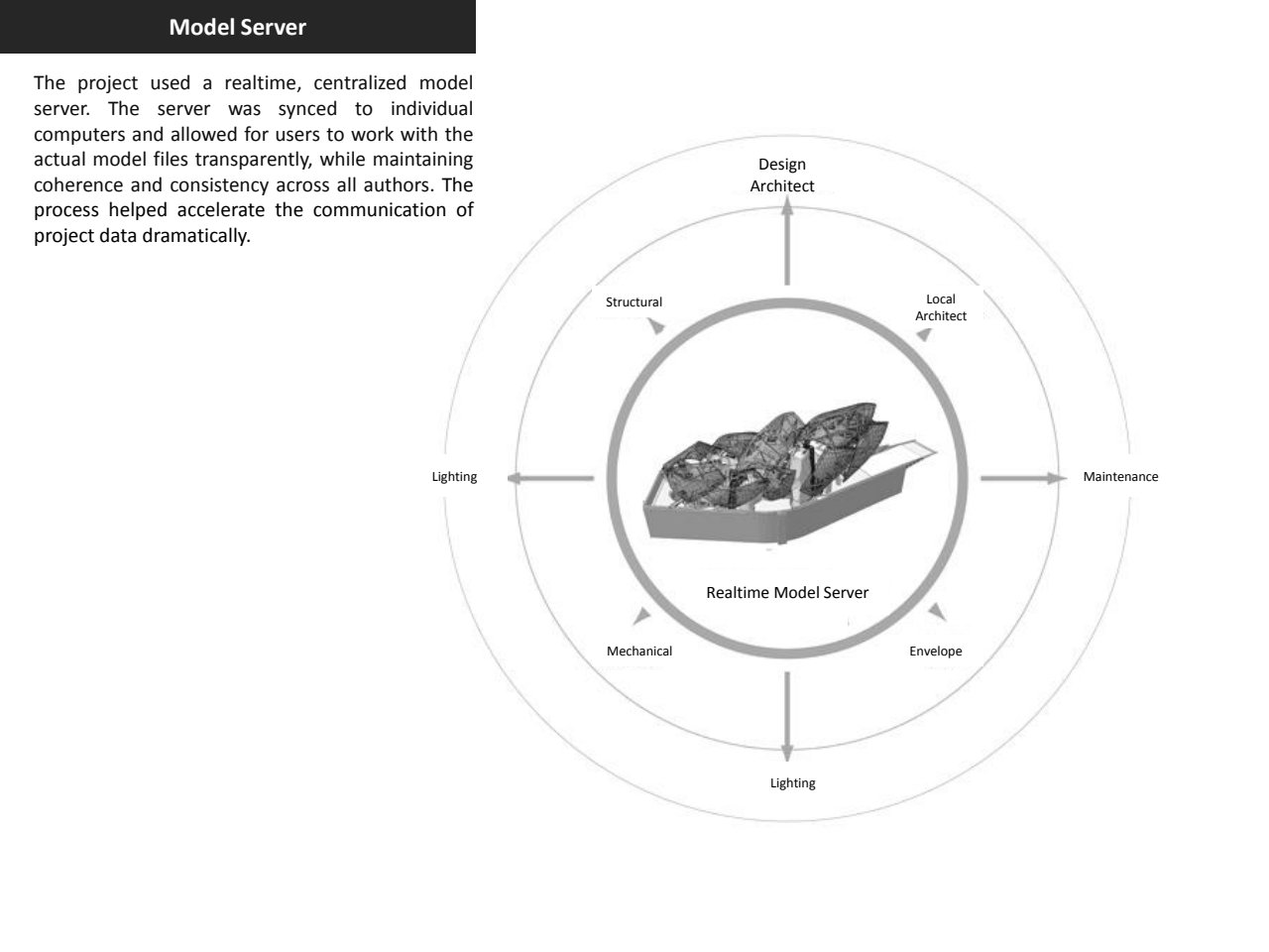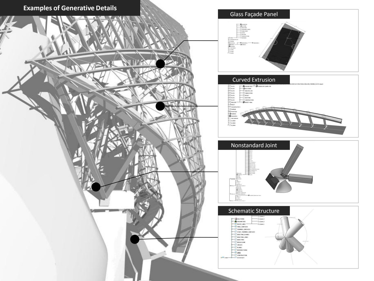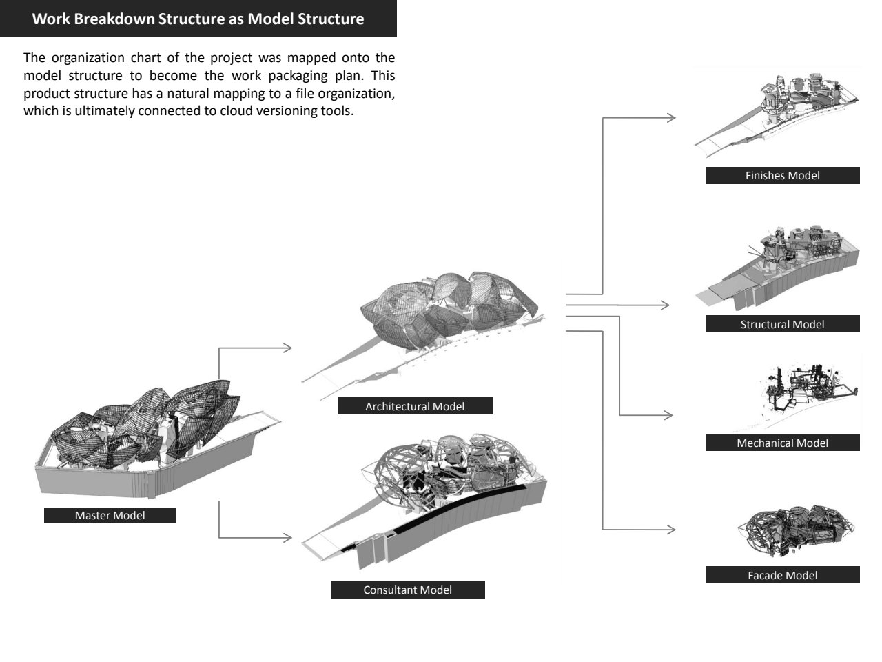 The complex structural design called for exact specifications and details of its different elements such as the curved sails and the iceberg’s surfaces. To facilitate this, a digital model of the structure was created using Digital Project software developed by Gehry Technologies for high-performance scalable 3D modelling.