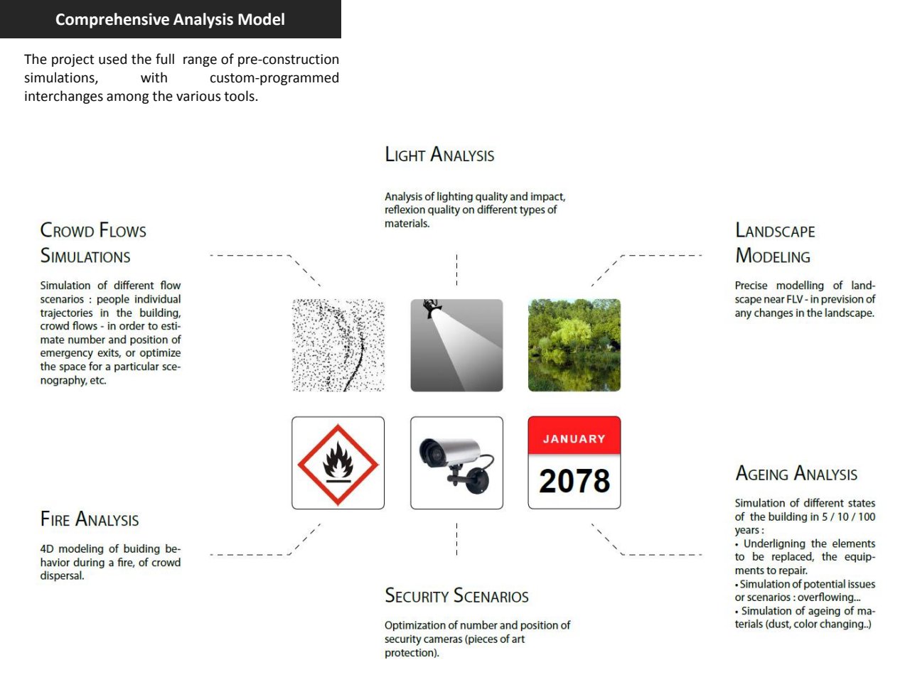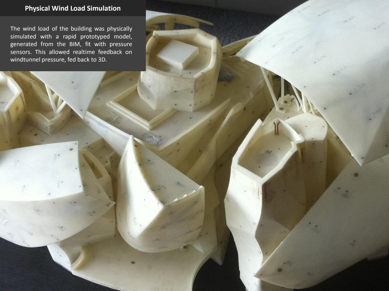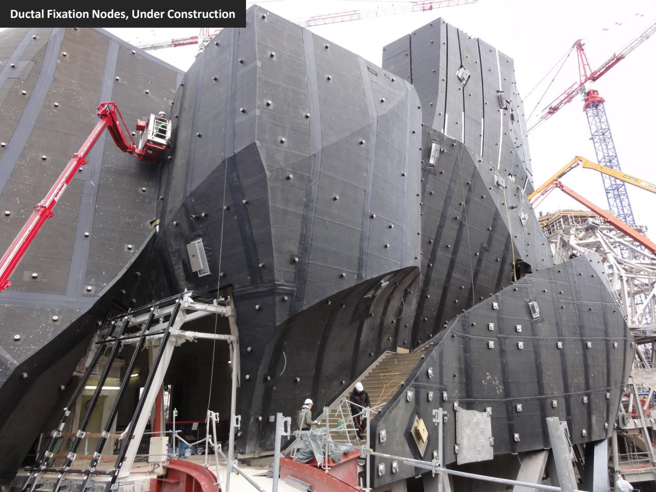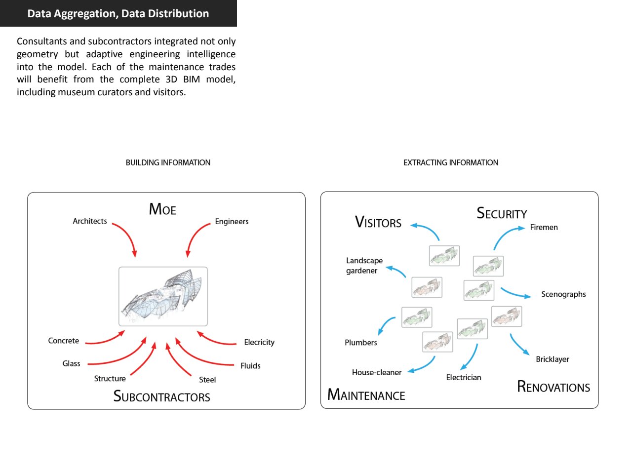 The complex structural design called for exact specifications and details of its different elements such as the curved sails and the iceberg’s surfaces. To facilitate this, a digital model of the structure was created using Digital Project software developed by Gehry Technologies for high-performance scalable 3D modelling.